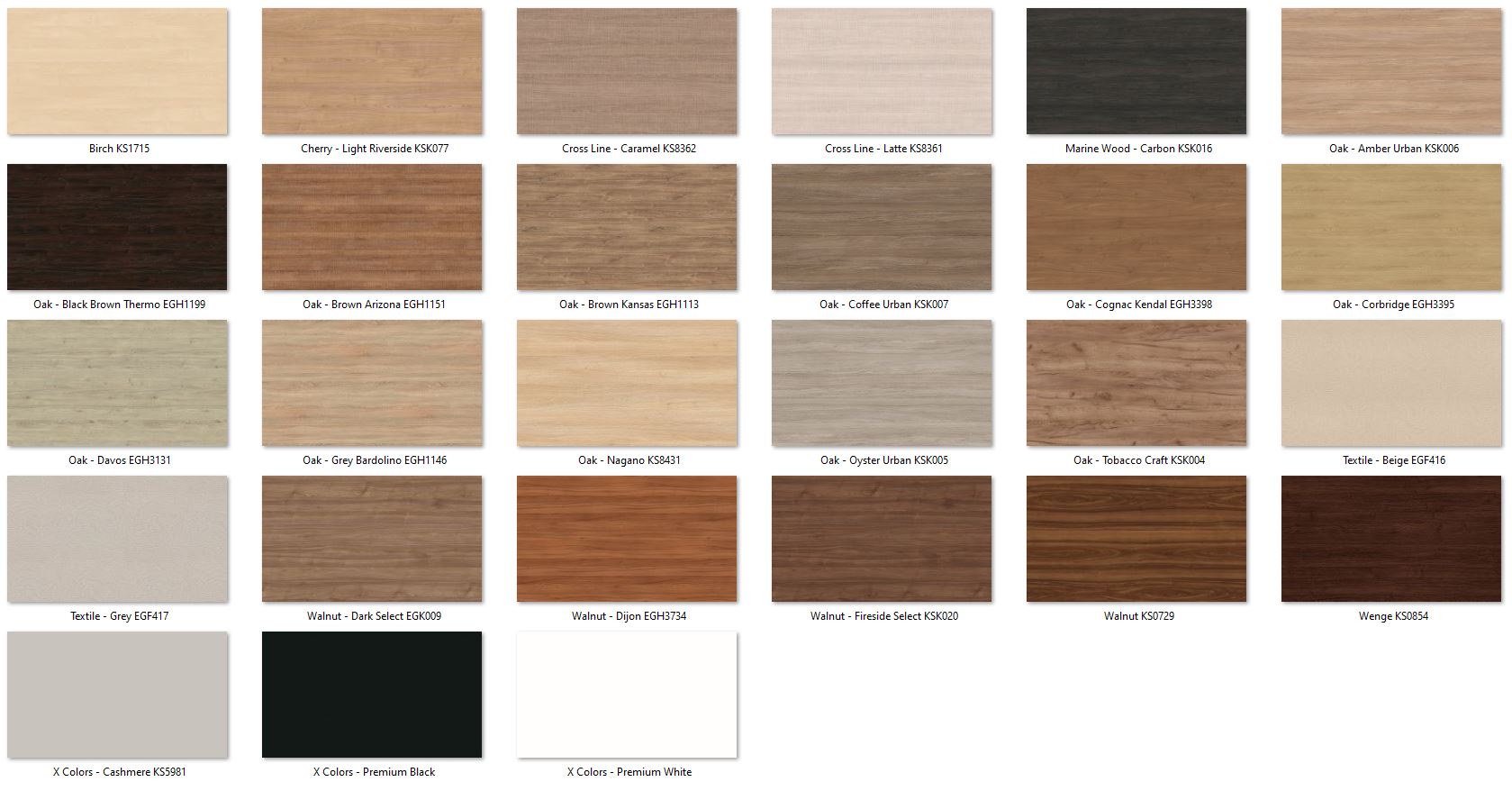Our material palette includes a wide spectrum of finishes, from classic colours like Premium White to rich wood-inspired decors such as Natural Dijon Walnut, Cognac Kendall Oak, and stone-derived textures like Light Grey Chicago Concrete.